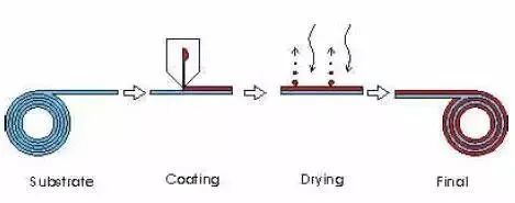 首先將一卷基材(如PP、PET、PI、銅箔等),經(jīng)過涂布裝置將涂料披覆于基材上,再經(jīng)過干燥過程將溶劑移除,最后收卷成卷,即為成品或半成品使用。最簡單的例子就是膠帶的制作,其制作過程是將感壓膠披覆在OPP或PVC上,經(jīng)過烘箱干燥后收卷,再經(jīng)過分條包裝即可販賣,不過這種涂布技術(shù)較為簡單 (我們稱之為傳統(tǒng)涂布方法)。