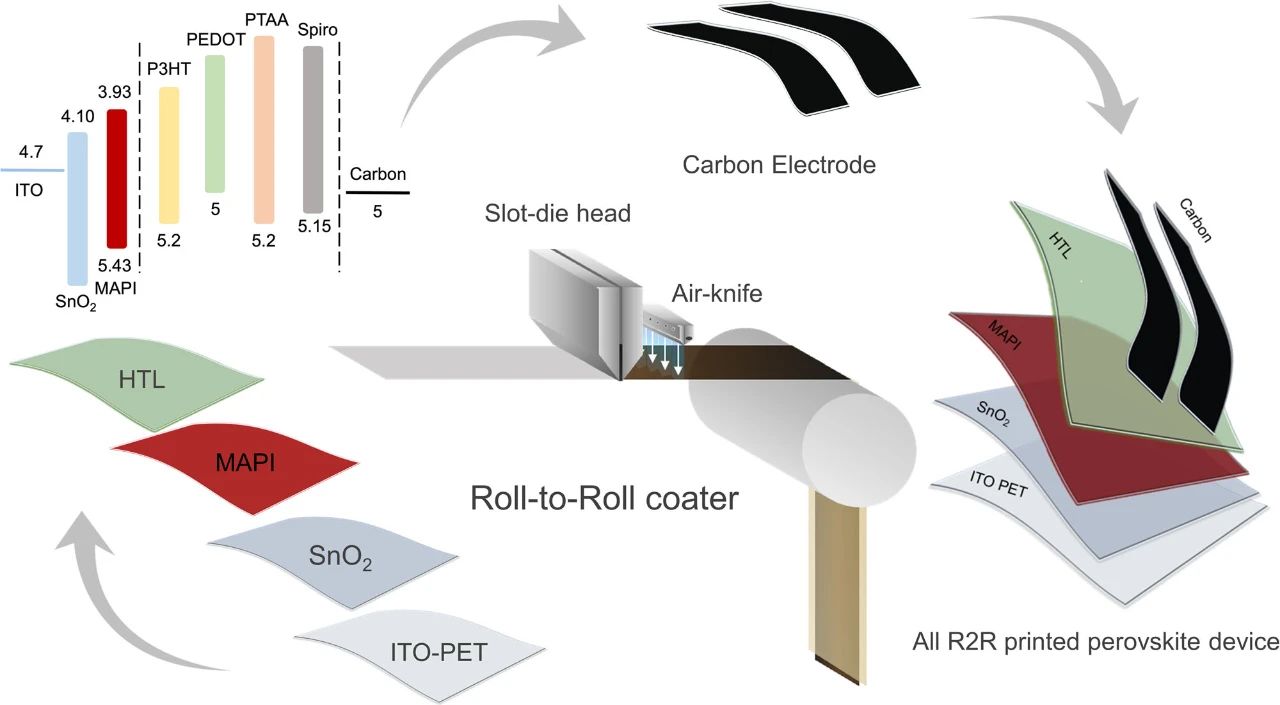 圖1展示了我們的涂層堆疊示意圖,包括的空穴傳輸材料有:spiro-MeOTAD、PTAA、P3HT和PEDOT,這幾種材料均有可能應用到R2R涂布工藝中。
