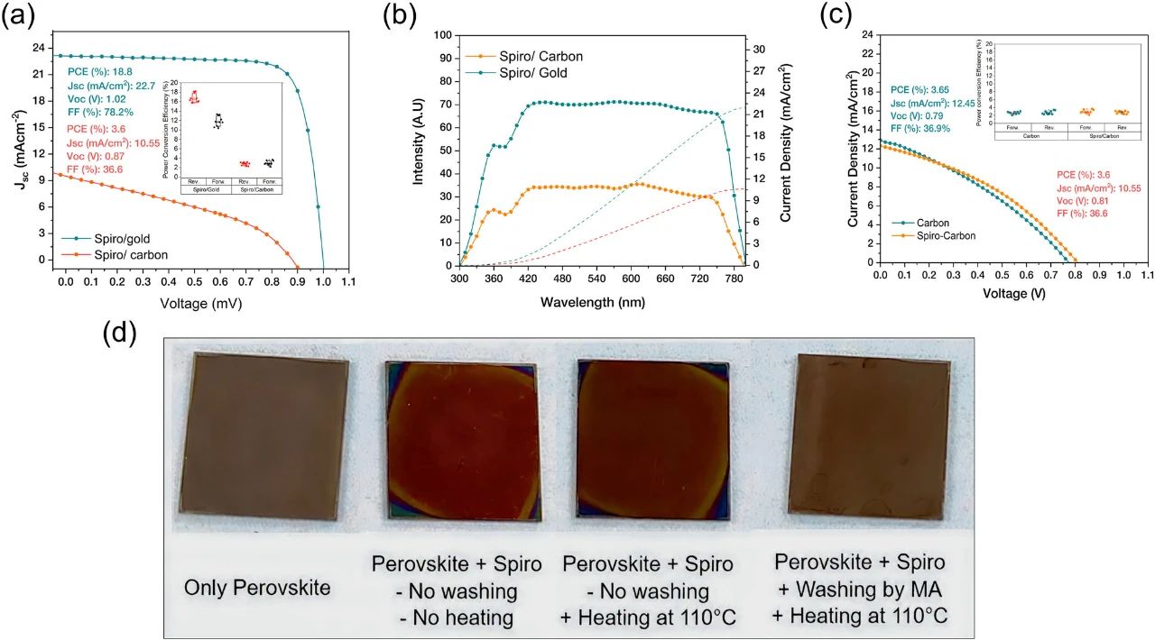 相反,這些發(fā)現(xiàn)說明了Spiro層會發(fā)生分解或結構改變,導致其空穴傳輸特性喪失。有無螺旋層的器件的J—V曲線和圖框PCE結果的相似情況進一步說明了在涂有碳層后部分去除螺旋層并發(fā)生化學變化的觀點,如圖2c所示。此外,鈣鈦礦/螺旋樣品的實際照片也顯示出明顯的變化,如圖2d所示。由于成分的變化,加熱會輕微改變涂層的顏色(XPS補充表1),而用碳墨溶劑(2-甲基甲磺酸)洗滌涂層則會完全去除螺旋層。
