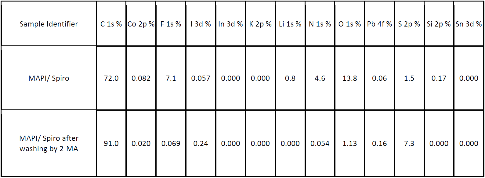 PTAA由于其優(yōu)越的空穴傳輸性能和卓越的熱穩(wěn)定性而成為一種非常有發(fā)展前途的中間層。為了評估其適用性,我們在碳電極基PSCs中進行了PTAA (o -二甲苯)的性能分析和相容性評估。我們制備了玻璃/鈣鈦礦/PTAA樣品作為相容性評估的一部分,然后用碳墨水溶劑2-甲基甲磺酸對它們進行處理。圖3a清楚地顯示了該層淬火能力的明顯變化。為了進一步了解,還對類似樣品進行了2-甲基甲磺酸洗滌前后的XPS映射(圖3b,補充圖2和補充表2)。