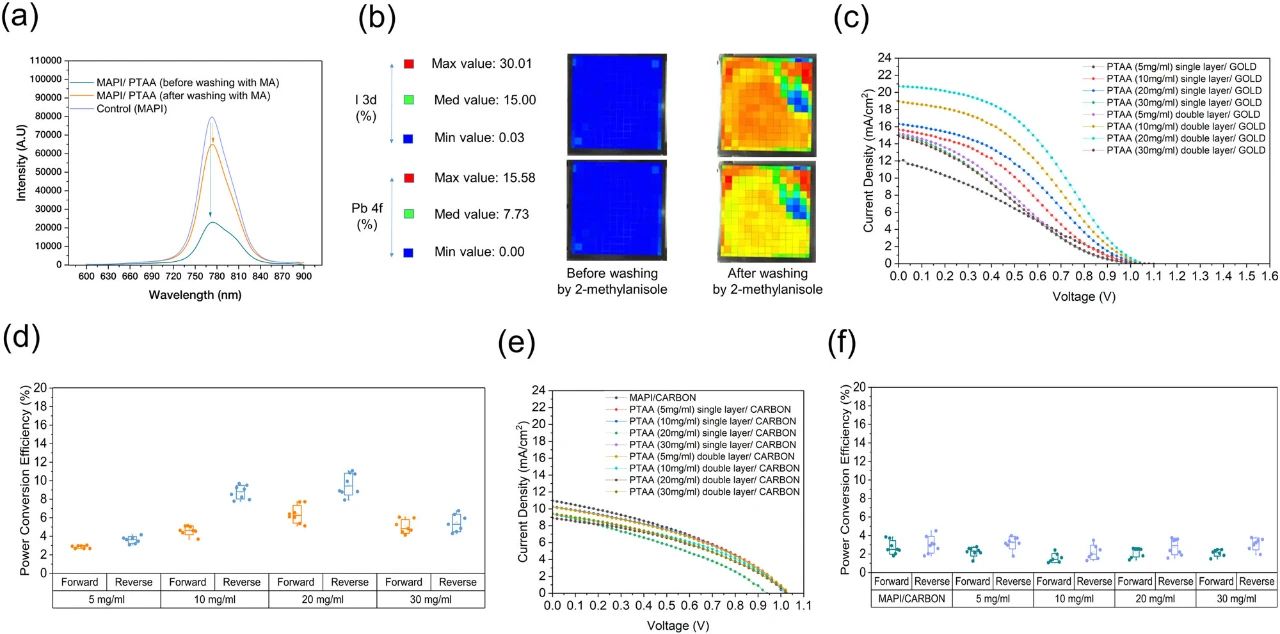 為了確定PTAA在鈣鈦礦層上的覆蓋范圍,于是在鈣鈦礦層表面檢測了碘化物和鉛兩種元素。從圖3b中可以看出,在洗滌之前樣品明顯有效地完全覆蓋了底層鈣鈦礦層。用溶劑洗滌樣品后獲得的XPS圖可以明顯觀察到表面有碘化物和鉛的跡象,驗證了碳墨水部分去除下層PTAA的假設。結合這些結果,比較了碳電極器件和金電極器件的光伏性能。圖3c、d的J—V曲線和PCE圖框結果清楚地表明,PTAA/金電極器件的效率隨著PTAA濃度(厚度)的增加而提高。為了獲得更大的厚度,我們還生產了雙層涂層PTAA層的PSCs,曲線顯示,雙層涂層的PTAA濃度越高,電流密度越高(圖3c, d)。相反,圖3e, f顯示PTAA/碳電極器件在所有濃度下都表現(xiàn)出較低的轉化效率,幾乎沒有變化。我們還觀察到所有的金電極器件呈現(xiàn)s形曲線,證實了之前弱PL淬火前溶劑洗滌的發(fā)現(xiàn)。即使PTAA/ 金電極設備是可操作優(yōu)化的(優(yōu)化功率轉換效率 ~12%),它們也可能不是空穴傳輸材料的最佳性能選擇,除非進行額外的優(yōu)化。在PTAA/碳電極的PSCs中,無論層厚或溶液濃度如何,PV性能與PL和XPS結果相似,證明了PTAA和2-甲基甲磺酸是不相容的。