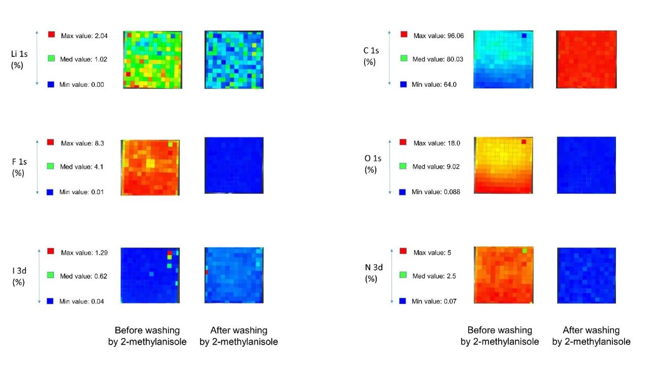補充圖2 在用鄰甲苯胺洗滌前后,Spiro層中的Li、F、I、C、O和N元素的XPS元素圖譜。