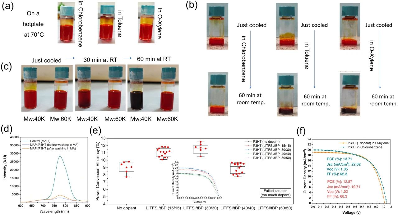 此外,具有較高分子量的P3HT從螺旋狀轉變?yōu)榘魻罹酆衔锏膬A向降低,以及從棒狀聚合物轉變?yōu)槟z狀(結晶)的傾向降低。圖4c表明,分子量(MW)為50-70 K的P3HT與分子量為30-60 K的P3HT相比,更不容易發(fā)生凝膠化。為了延長P3HT溶液在鄰二甲苯中的耐久性和延遲凝膠過程,在應用前對溶液進行了10分鐘的超聲處理,延緩凝膠發(fā)生的過程,從而延長了溶液的使用壽命。