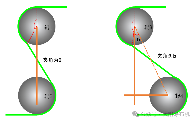 當(dāng)兩輥軸線完全平行時,該夾角為零;若一輥沿水平方向偏移,則兩輥間形成水平夾角,包角隨之增大。