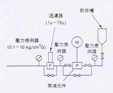 另外涂料輸送時需避免受到雜質(zhì)的污染或氣泡的產(chǎn)生,以防止涂布加工上的缺陷發(fā)生,因此在輸送涂料過程中都會加裝過濾裝置及消泡機構(gòu),以確保涂布質(zhì)量;此外設(shè)備也會裝上壓力表或數(shù)字壓力計進行在線監(jiān)控,以防止濾壓過大而停工。一般涂料輸送系統(tǒng)之示意圖如圖七所示,其主要項目包括有消泡機構(gòu)(De-Gassing)、過濾器(Filter)、靜態(tài)混合裝置(Static Mixer)、壓力傳感器(Pressure Sensor)等。