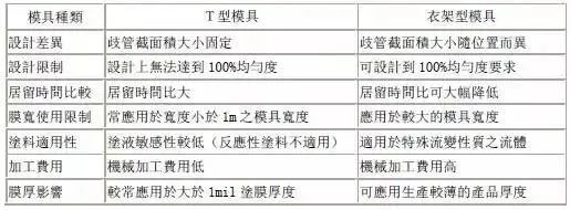 表二 T型模具與衣架型模具之比較