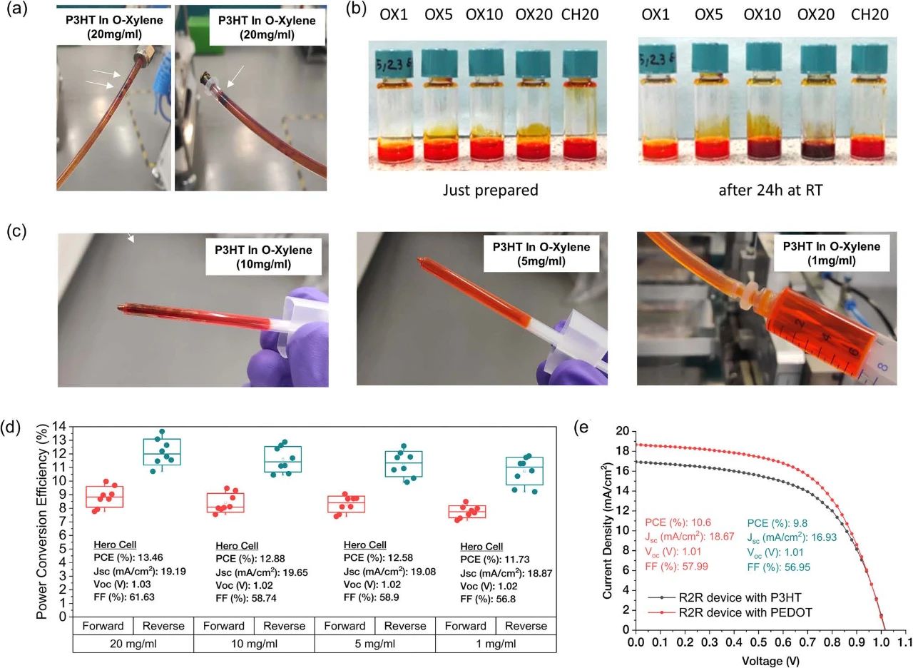 為了解決這一問題,在鄰二甲苯中加入較低濃度(從20 mg ml - 1降至1 mg ml – 1)的P3HT進行實驗。圖7b比較了鄰二甲苯和氯苯中不同濃度(20、15、10、5和1 mg ml−1)的P3HT溶液的耐久性。觀察在室溫下保存24小時的小瓶的照片,發(fā)現(xiàn)在鄰二甲苯中的P3HT濃度低于10 mg ml−1時沒有凝膠化的跡象。圖7c進一步支持了P3HT在濃度低于10 mg ml−1的o -二甲苯中溶解時不會沿著管壁聚集的觀點。圖7d顯示了不同濃度P3HT的自旋涂布器件的結果,通過將濃度從20 mg ml - 1降低到1 mg ml – 1,由于其較低的厚度使功率轉換效率略有下降。