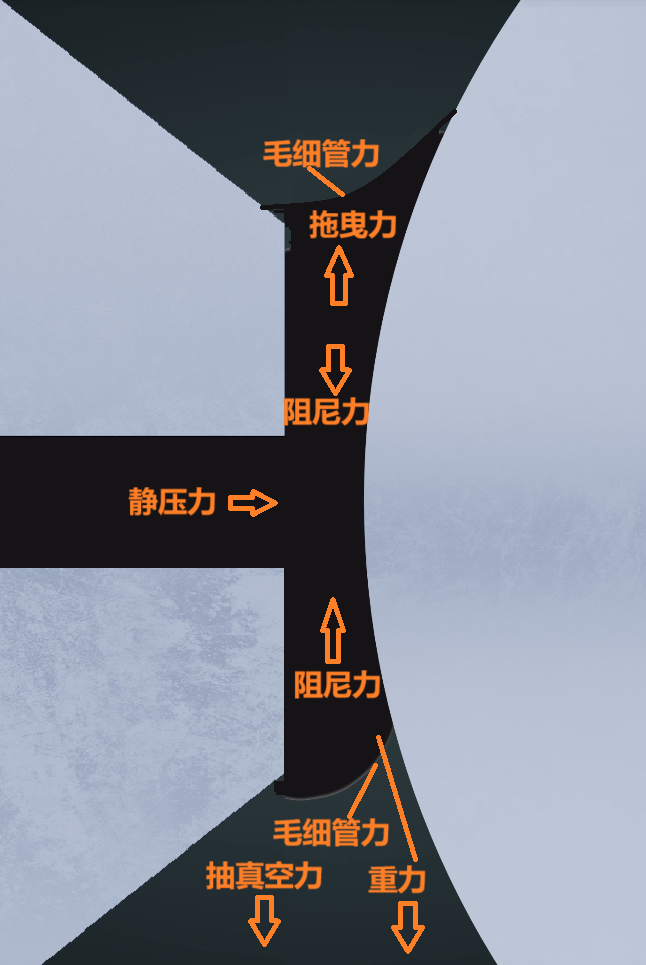首先,表1中的六種作用力在從涂布模頭腔體擠出的左右兩側(cè)都存在受力平衡,左右兩側(cè)的阻尼力作用方向相反,而表面張力的作用方向則依賴兩側(cè)彎月面的凹向形狀。當(dāng)涂布發(fā)生漿料滴落、空氣卷入等問題時,我們可以首先分析涂珠兩側(cè)的受力平衡情況,分析作用力方向和合力情況可以參考圖1繪制的各種作用力方向。