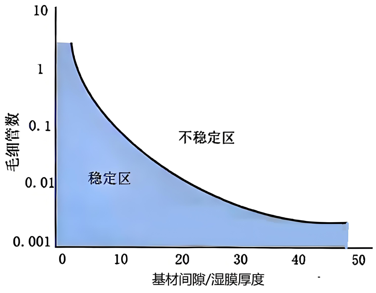 很多論文和網(wǎng)絡(luò)帖子用毛細(xì)管數(shù)和間隙比兩個無量綱數(shù)分別做出橫坐標(biāo)和縱坐標(biāo),做圖繪制出一個適合涂布的操作窗口形狀,如圖2所示。其本質(zhì)阻尼力和表面張力這兩個受力平衡的緩沖作用都不能太小,如果因間隙比增大導(dǎo)致阻尼力減小,那么毛細(xì)管數(shù)必須很小表面張力才能變得很大,如果毛細(xì)管數(shù)也很大而表面張力很小,那么涂珠的推力與拉力平衡就必須非常精準(zhǔn),這個在實際涂布工作中很難實現(xiàn)的。