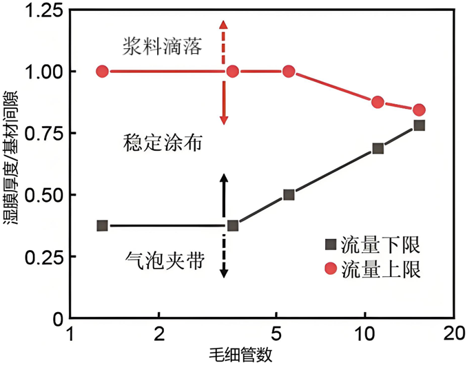 (1)式1中毛細(xì)管數(shù)的流體運動速率,在涂布時可以用基材拖曳漿料的速度(涂布速度)來代表。除了毛細(xì)管數(shù),其他常用來表征操作窗口的無量綱數(shù)還包括基材間隙與濕膜厚度的比值等。